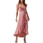 Be the first to review “ASTR The Label Women’s Satin Ruffled Maxi Wrap Dress with Deep V-Neck”
